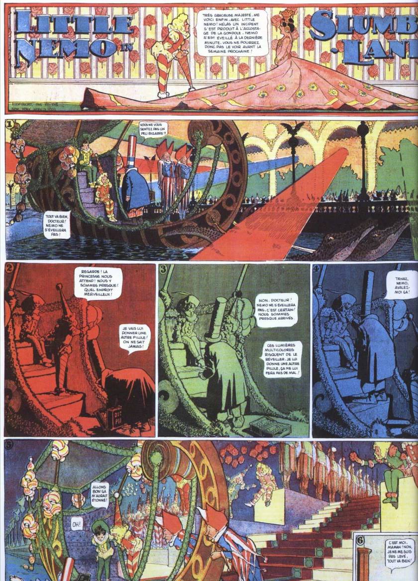 Winsor McCay had already established his reputation as a comic-strip artist with his creation of Little Nemo in Slumberland – an art nouveau comic strip reproduced in full colour and syndicated around the world – when he began to extend and enhance his drawings into animated films, live lectures and stage performances with projected images. McCay’s storytelling genius – the seemingly endless variations of what happened every night between Little Nemo falling asleep and waking up in the morning – is revealed in this masterpiece of visual narrative – his ‘framing’ just beginning to reflect the innovations in lenses and cinematography introduced in the previous decade or so. Look at the page above – the storyboard-cinematographic framing and styling, even the colour gel ‘tints’ used to colour monochrome frames – all reveal how much McCay was aware of the explosion of imagery he was witnessing at the end of the Belle Epoque.
